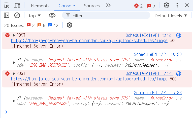 이를 해석하면, 서버에 이미지 업데이트를 요청했을 때 상태코드 500의 Axios 에러가 발생함을 의미한다. 즉, 서버가 이미지 업데이트 요청을 받아 응답하는 동작이 정상 작동하지 않은 것이다.