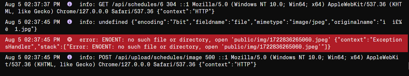 마지막 로그는 클라이언트의 이미지 업로드 요청에 대한 기록이다. 서버 오류를 뜻하는 상태코드 500이 눈에 띄었다.