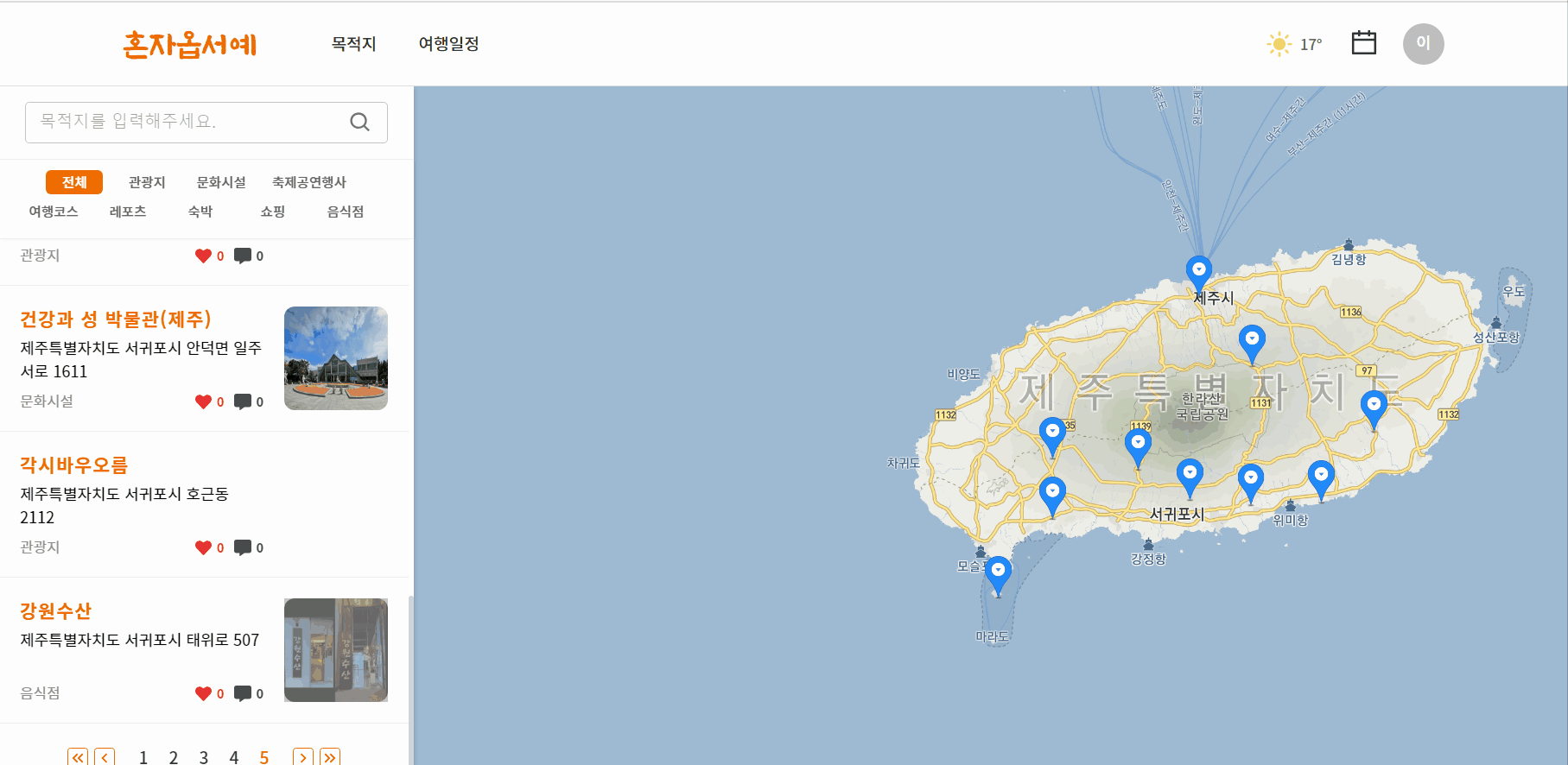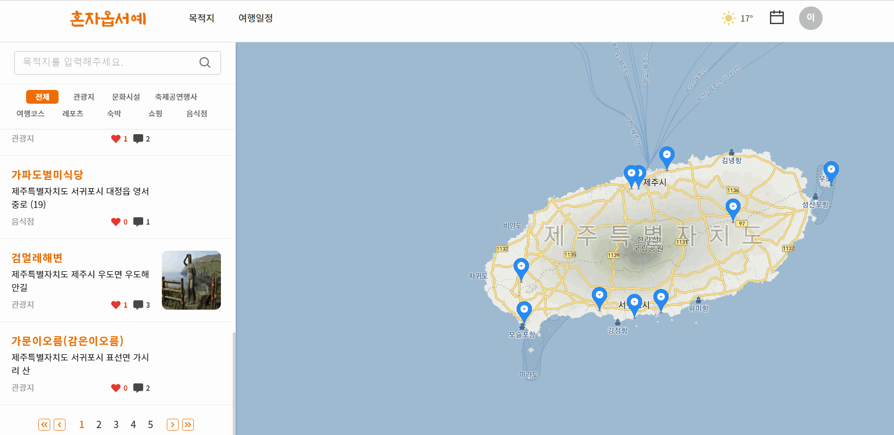 목적지 페이지는 제주도의 여행지 목록이 표시되는 목적지 리스트와, 이 목적지 리스트와 연동되어 해당 목적지(여행지)의 위치가 마커로 표시되는 지도로 구성되어 있다.