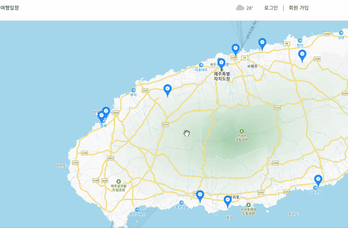 내가 담당한 여행지(목적지) 리스트 페이지는 위치 데이터를 기반으로 카카오 맵에 여행지를 마커로 표시해주는 기능을 제공했다.