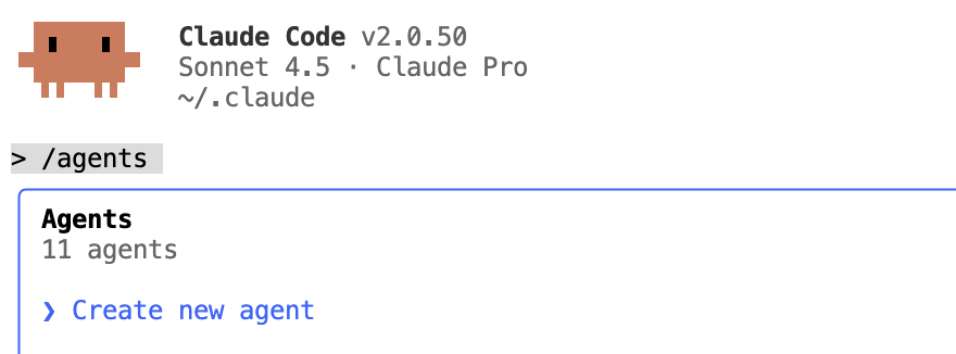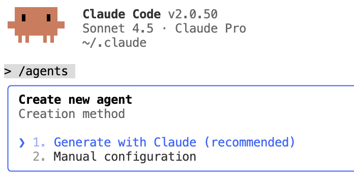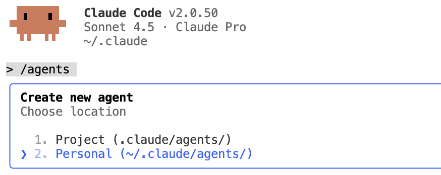 에이전트를 만드는 건 어렵지 않았습니다. 우선 claude code를 실행한 뒤 /agents 명령어를 입력하고 새로운 에이전트 생성(Create new agent)를 선택하면 됩니다. 이후에는 에이전트의 역할을 생각하며 선택지를 고릅니다.