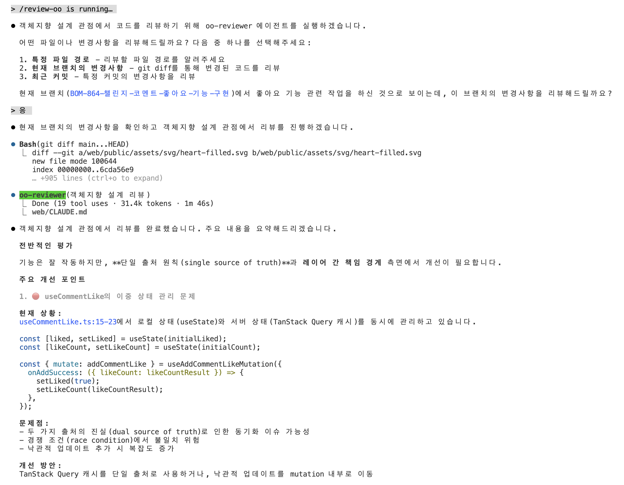 이제 /review-oo만 입력하면 저는 추가적인 프롬프팅이나 컨텍스트 전달 없이 원하는 방식으로 역할과 책임에 맞는지 코드를 검증할 수 있게 되었습니다. 생각보다 토큰이 절약되지는 않았지만 단순 반복 프롬프트 작업을 명령어 하나로 단축할 수 있는 점에서 큰 메리트가 있다고 생각합니다.