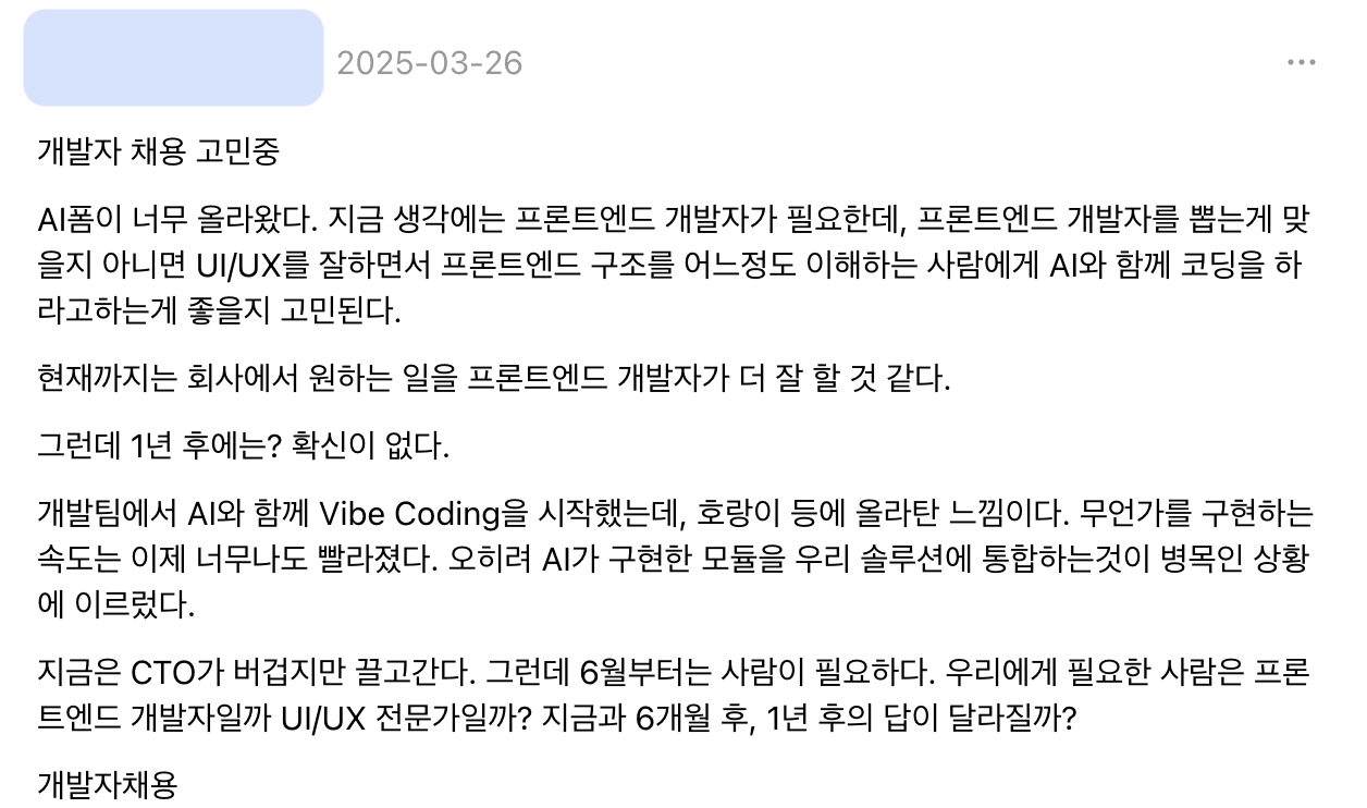 레벨1의 마지막 강의가 끝나고, 크론이 쓰레드(Thread)의 글 하나를 공유하였다. 한 회사의 관계자가 프론트엔드 개발자를 채용할지, 아니면 UX/UI에 능통한 프론트엔드 지식 보유자를 채용해 AI와 함께 업무를 수행하도록 할지 고민하는 글이었다.